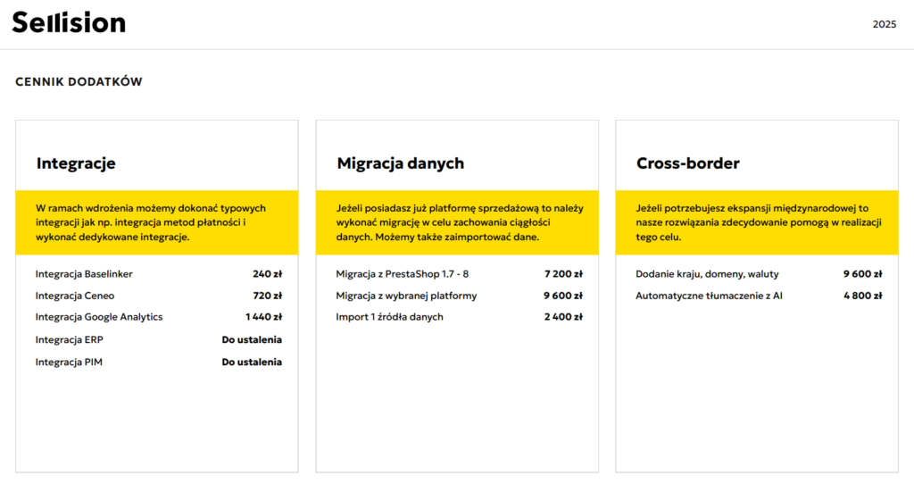Jak powinno to wyglądać? W Sellision migracja to precyzyjnie wyceniona usługa programistyczna. W naszym cenniku znajdziesz konkretne pozycje, takie jak „Migracja z PrestaShop 1.7-8” (7 200 zł netto) lub „Migracja z wybranej platformy” (9 600 zł netto). Ta kwota nie pokrywa kosztu „modułu”, ale realną pracę deweloperów: analizę struktury, napisanie dedykowanych skryptów mapujących dane (tzw. ETL) i weryfikację integralności każdej tabeli.
