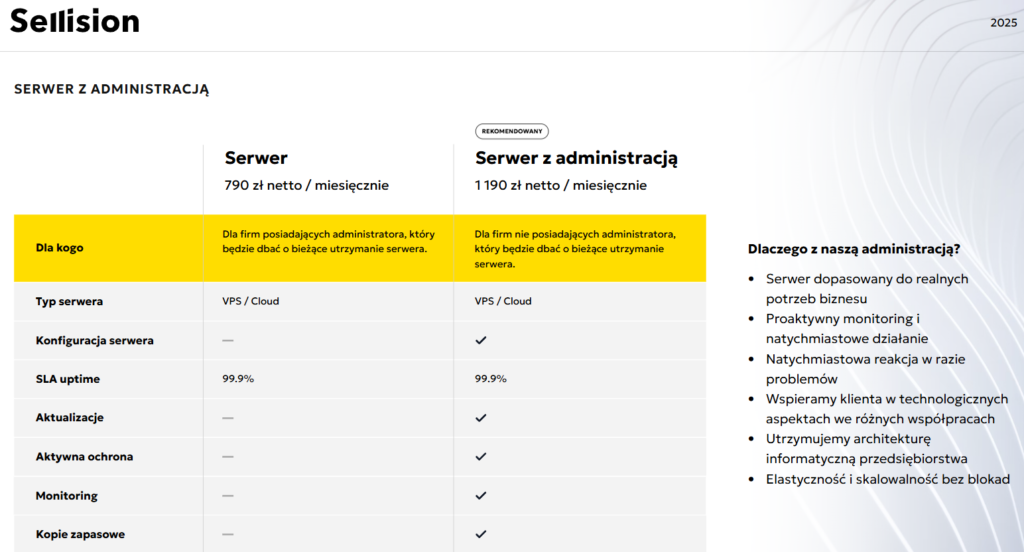 Jak powinno to wyglądać? Wydajność musi być fundamentem projektu, a nie „dodatkiem”. W Sellision jest to nasza obsesja. Gwarantujemy, że wdrożenia Sellbox osiągają „100% wydajności pagespeed” i „Core Web Vitals powyżej 90%”. To nie jest obietnica marketingowa, to zobowiązanie techniczne. Rozumiemy też, że oprogramowanie to jedno, a infrastruktura to drugie, dlatego oferujemy kompletne pakiety „Serwer z administracją” , które są idealnie dopasowane do PrestaShop i gwarantują proaktywny monitoring i skalowalność .
