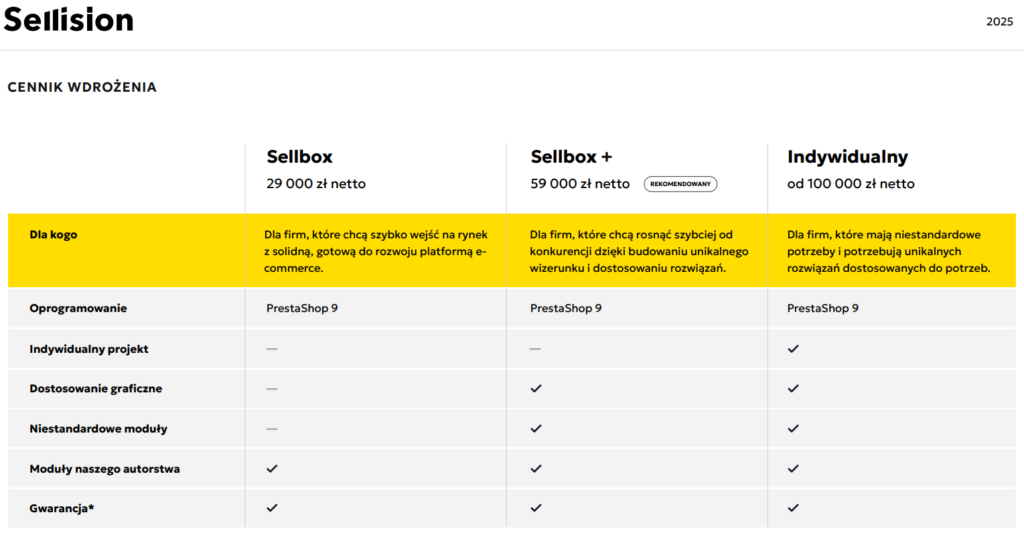 - Sellbox (29 000 zł netto): Szybki start na gotowej do rozwoju platformie.