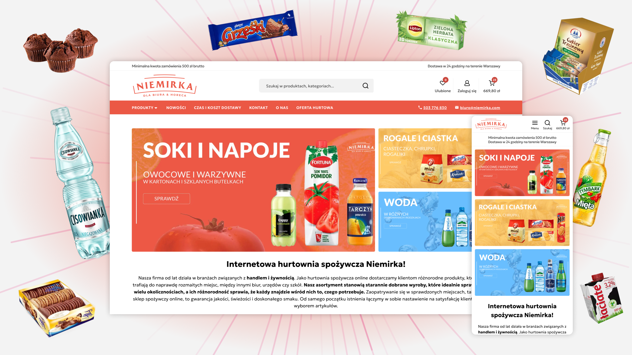 Wdrożenie nowego sklepu internetowego dla hurtowni spożywczej Niemirka zakończyło się pełnym sukcesem. Efekty naszej kompleksowej pracy, od analizy po wdrożenie, można zobaczyć w nowej odsłonie sklepu B2B klienta. Całkowity czas realizacji projektu wyniósł 197 godzin , a całe wdrożenie udało się zrealizować w ciągu 2 miesięcy od momentu rozpoczęcia prac.
