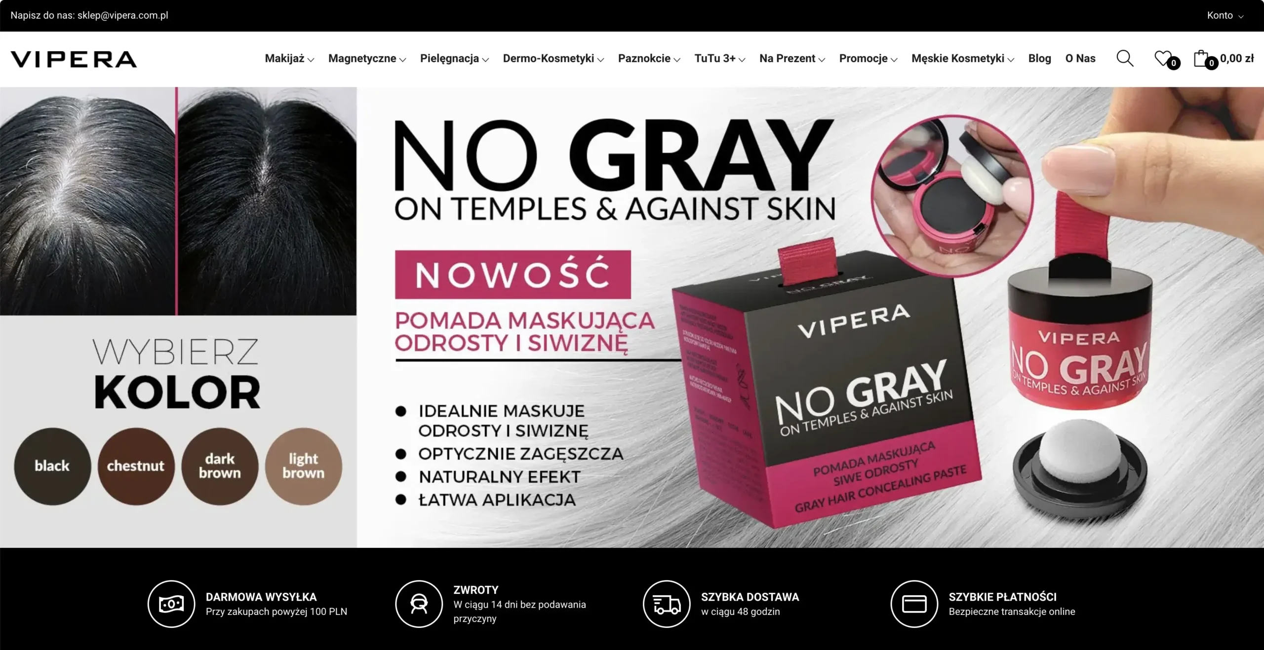 Vipera Cosmetics to marka z bogatą tradycją, dlatego wdrożenie sklepu internetowego musiało dorównać i idealnie odzwierciedlać ofertę firmy. Klient zwrócił się do nas, aby wykonać wdrożenie nowego sklepu, który poprawi wizerunek w Internecie oraz pozwoli marce na efektywniejszą pracę w marketingu.
